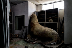 A middle school in the mountains of Hokkaido. Lots of snow outside and lots of water and deer shit inside. In a dark room I found a huge giant stuffed seal wedged into a corner.