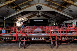 The front entrance was far too open and exposed for my liking and some kind of local election thing at the time had people driving around in mini vans yelling slogans through loud speakers, so I decided to take a 20 minute walk down a quiet road and use the back entrance. I climbed through a fence and some prickly bushes and found myself surrounded by little fibreglass Tepee’s (which were really cute) and ventured on to find a small fake western town with a hotel, church and a few other small buildings. I took a few outdoor snaps then found a large restaurant with a Mexican theme called ‘Café Ponchos. It was locked so I opened the door by putting my hand through a broken pane of glass and turned the handle from the inside. Dusty chairs and tables were scattered everywhere and plates, cutlery and salt and pepper shakers were still sitting on shelves in the kitchen. Bags of rice and sugar remained in the large pantry and cooking utensils still sat on the sinks and kitchen benches.