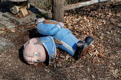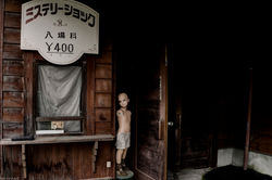 I found a huge restaurant with a creepy miniature version of Mount Rushmore sitting on a table. Plastic cloths still remained on the tables and would rustle now and then as the wind blew through the broken windows. Large decayed weather beaten American flags hung on the walls and water dripped from the ceiling - it was very cool. Moving on I found an amazingly creepy shooting gallery which looked untouched (apart from dust covering the mannequins). Had this been anywhere else in the world, it would’ve been pillaged and vandalised a long way back. But Japan has more respect than that, and I was so happy that it remained intact and preserved. I found a few mannequins lying on the ground and a ratty, damp moose head (a stuffed one which had obviously once hung on a wall as a prop) on the ground amongst some dead leaves. Things got more fun when I found more mannequins standing in shops – really eerie stuff because I was the only person in the entire space with nothing but these creepy dummy’s staring out at me through dirty windows (for those that know the movie….it was very ‘Tourist Trap’ - link).